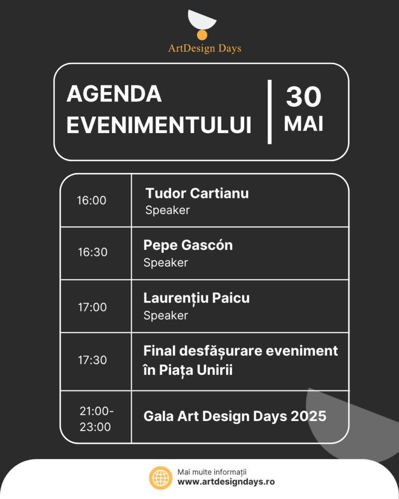 Punctul culminant al festivalului este Gala ArtDesign Days, organizată vineri seara, pe 30 mai. Este un moment dedicat recunoașterii inovației și colaborării interdisciplinare, în care vor fi premiate proiecte de impact și contribuții remarcabile în domeniul designului.